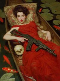 at it, jabs at it with the dissonance of virtual life and in