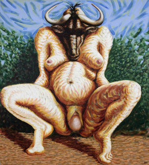 WILDEBEEST WOMAN Wildebeest Woman is about the deep place women have recourse to during birthing. Having participated in the birth of my children, it was interesting to note the loss of consciousness as deeper, animal instincts took over. Bovines seem to epitomize inner strength and ability to suffer. The doctor who delivered my first born, which took 36 hours, had been working in the Congo region where he said the African women had very few problems delivering. He ascribed this to the fact that they worked in the fields and in many cases even gave birth there. Apparently the squatting position is quite beneficial as an aid to deliverance.