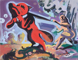 FRESH POP NYC There is a depth to the narrative behind Jesse McCloskey's shocking expletive where the dog/devil and girl/witch act out. The works of Warhol, Lichtenstein, Rauschenberg and Johns used references that came from childhood and adolescence - guns, toys, cartoons, maps, targets, cars, posters, advertisements, televisions and more. Their youth had come from the upswing of consumerism and their interest had been informed by the milieu of a prosperous America. Jesse McCloskey grew up in New England, home of the witch trials, Plymouth Rock and the Mayflower, Pocahontas and then the normal - bad boys, naughty girls and dogs. Mix these essential components in with a Fine Arts education replete with references from art history and there is a clue to McCloskey's secret ingredients. There is an acknowledgment of suffering, wrong-doing, struggle and righteousness in the squiring of tales such as the one of a little girl of four years was tied, hands to feet, during the Inquisition - that in reality was based on property rights - in order to extract information on the devil. Quite the story to tell. Or Pocahontas spraying graffiti as the puritans wiped out her people. The struggle is not so easy to categorise as being 'renegade' or 'reactionary' once the impetus behind this work is explored. Abhorrent situations can be spellbinding so when he studies historical reference books for content of a nasty nature, gobbles it up and spews it out with a frenetic energy, the witchcraft has begun. There are stories that are common to cultures and ages that serve as templates for the common narrative of the time: the creation myths, the passion plays, the Greek tragedies, theatre del arte, classical allegories and biblical morality tales. The action within them serves to illustrate the temper of the time. Jesse McCloskey appears to have developed a current common narrative within the consistent imagery of the dog/devil and the girl/witch that he has used in paintings and drawings over a number of years. Are the dog and the girl with their hedonistic foreplay and wild abandon an apt metaphor for a debauched culture or is his work a release for both himself as the perpetrator of the imaginings and for the voyeuristic perspective? What might have seemed to be solely a flight of fancy into naughty-making, has now gained the credence of a commitment and the story has even progressed to encompass raunchier sexual exploits with more brutal retaliation against the harassment metered out by the 'other', be it dog or girl. This work is not as simplistic as the pitching of good against evil, despite the angelic face of the girl or the gradual leaning of the physiognomy of the dog to goat-ishness for the girl gets down and dirty as well. Neither is hanging on to appearances and in fact the girl has been showing her witch-y side, throwing back the liquor with apparent relish and riding the strangled canine hard. This is permissive abandon, bestiality and bad messy fun. There seems to be no moral amidst the searing colors and libidinous sweeps of paint. From the contemporary awareness of a world with a political climate of masked purposes, incomprehensible corporate power-mongering and materialistic prompts, it's a relief to spend some quality time following the scatological incorrectness of McCloskey's girl and dog.